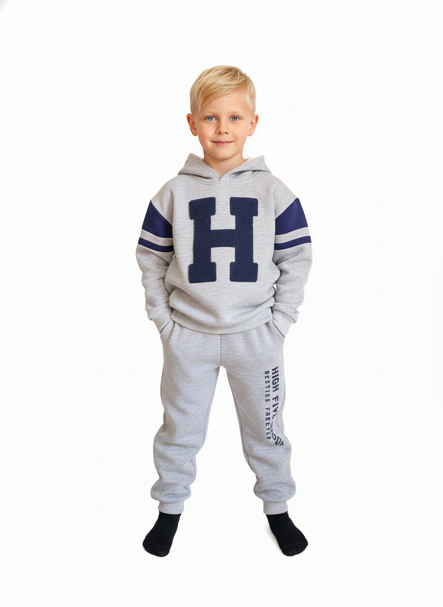 Kış mevsiminde çocuklarınızın hem şıklığını hem de sıcaklığını ön planda tutan bu gri kapüşonlu takım, modern tasarımıyla dikkat çekmektedir. Kapüşon, soğuk havalarda ek koruma sağlarken, H harfi nakış detayları, ürüne estetik bir görünüm kazandırmaktadır.