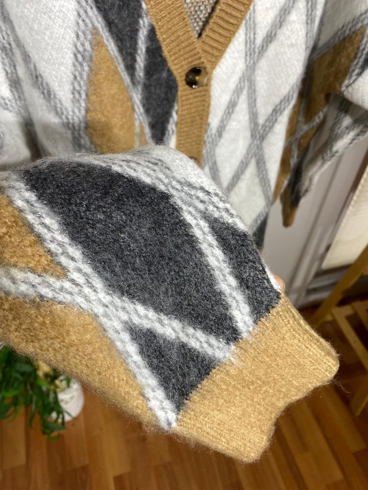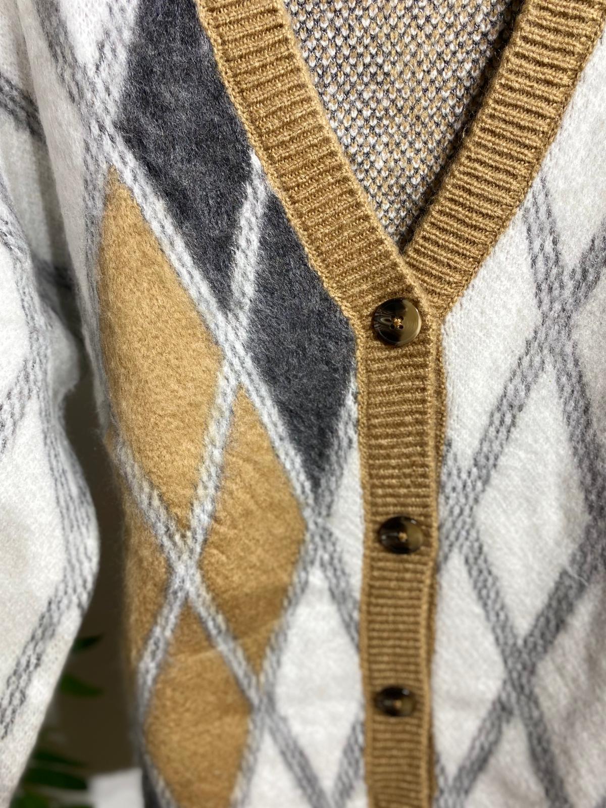 Geleneksel deseni modern bir dokunuşla birleştiren Argyle Desenli V Yaka Triko Hırka ile retro ve sofistike bir stil yaratın. Camel, kemik, gri ve siyah renklerinin mükemmel uyumu, bu hırkayı kış ve mevsim geçişi kombinlerinizin yıldızı yapacak.