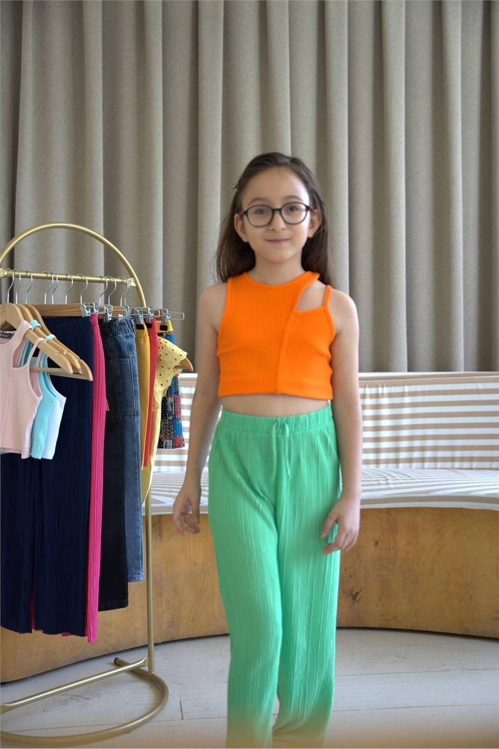 Kız çocuk modasında şıklığı ve rahatlığı bir araya getiren askılı crop, turuncu rengiyle dikkat çekmektedir. SONGÜLBERİK markası tarafından tasarlanan bu ürün, genç kızların yaz aylarında hem stil sahibi hem de konforlu bir görünüm elde etmelerini sağlar.