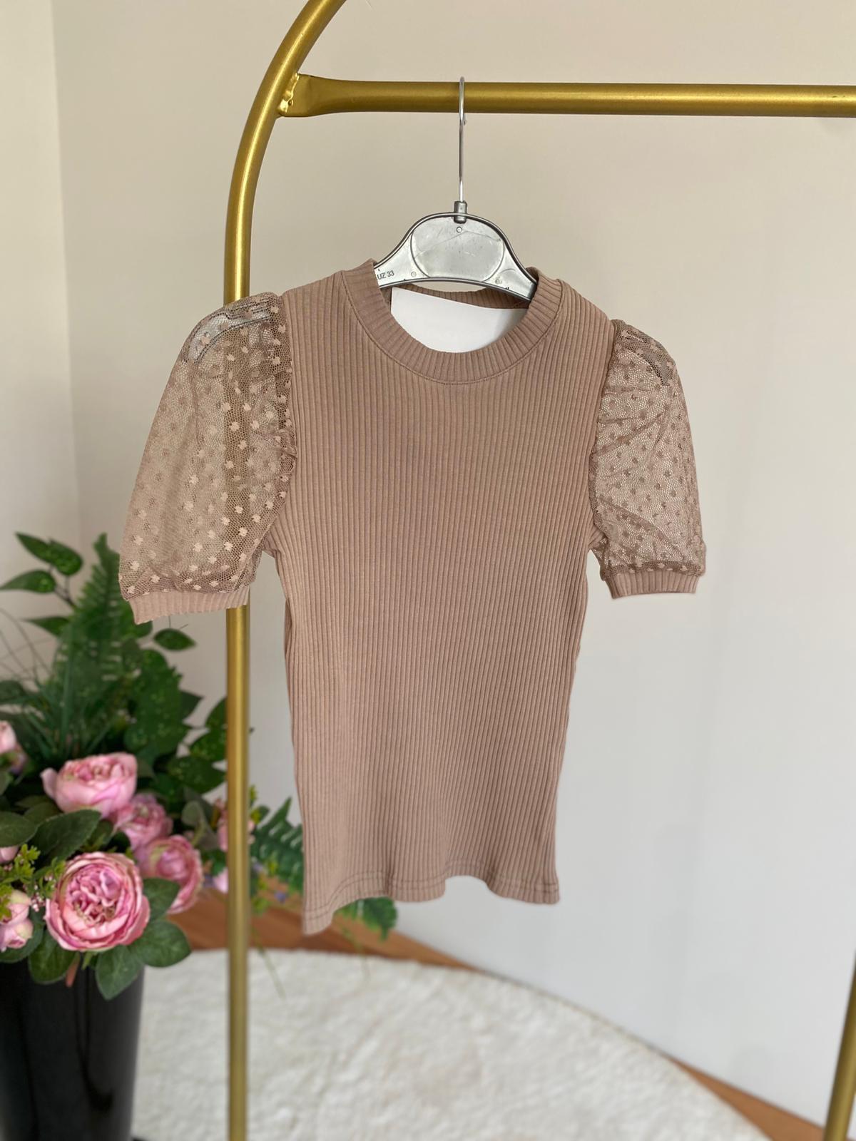 Kız çocukları için tasarlanmış olan bu bluz, şıklığı ve zarafeti bir araya getiriyor. Kahverengi tonlarıyla dikkat çeken bu model, balon kol detayları ve tül eklemeleriyle modern bir görünüm sunmaktadır.
