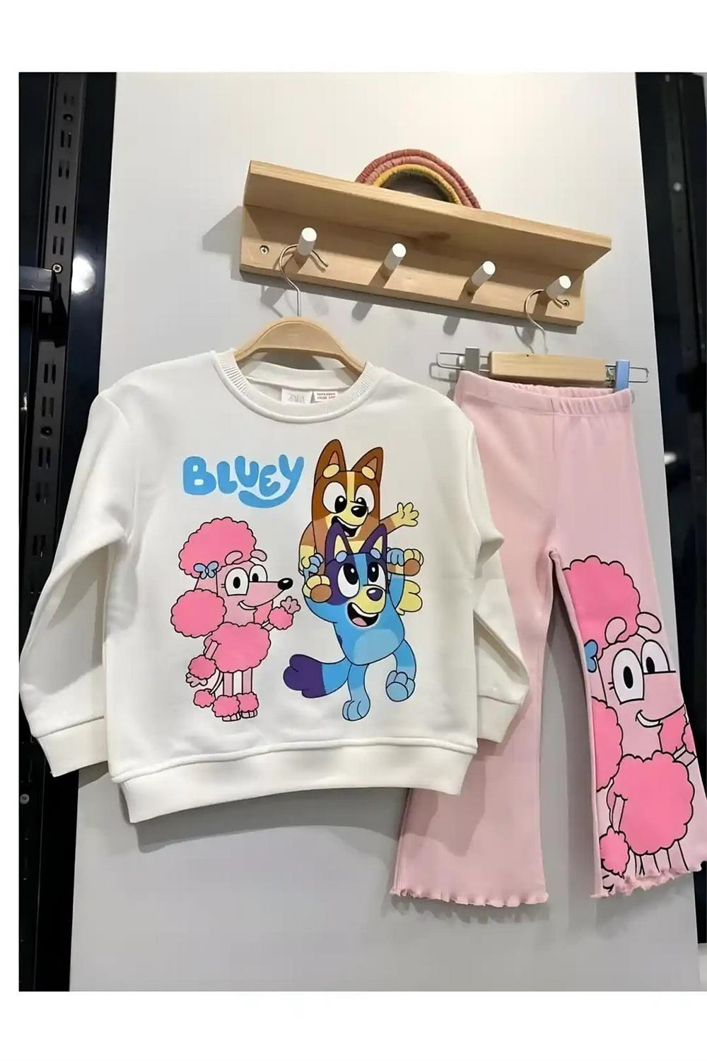 Küçük kızlar için tasarlanmış olan bu takım, eğlenceli Bluey karakter baskısıyla dikkat çekmektedir. Şıklığı ve konforu bir arada sunan bu ürün, çocukların günlük giyimde rahatlıkla kullanabileceği bir seçenektir.