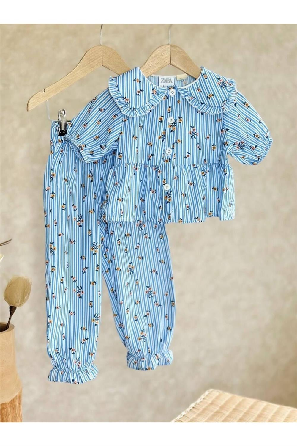 Mavi tonlarıyla dikkat çeken bu takım, bebe yaka detayı ve çiçek motifleriyle estetik bir görünüm sunar. Üst ve alt parçaların uyumlu tasarımı, çocukların hareket özgürlüğünü kısıtlamadan şıklıklarını artırır. Takım, 3-4 yaş, 4-5 yaş ve 5-6 yaş beden seçenekleriyle geniş bir yaş aralığına hitap eder.