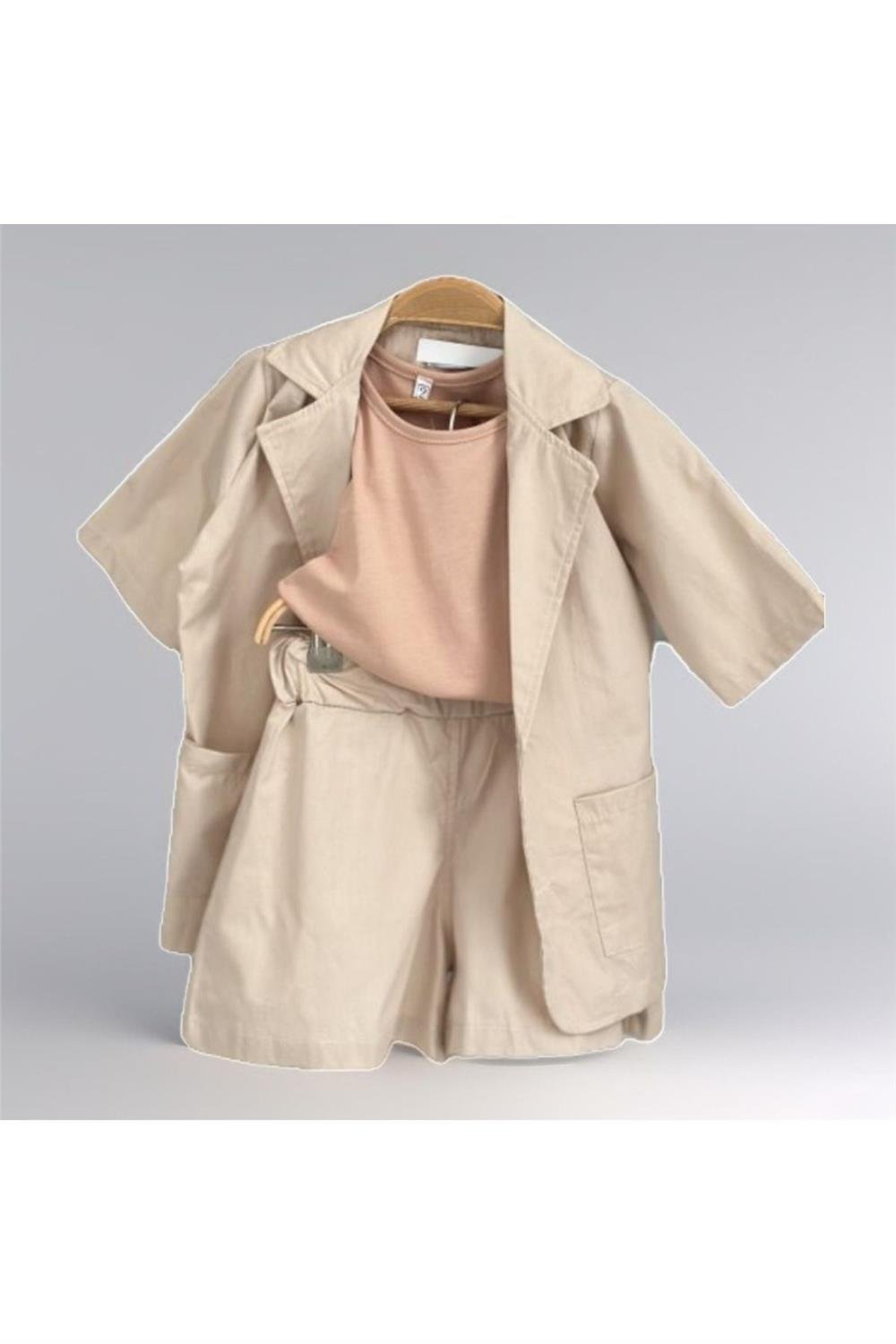 Bu üç parçalı set, şık bir blazer ceket, esnek bel yapısına sahip şort ve konforlu bir body içermektedir. Ceket, dirsekte sonlanan kol boyu ve çift düğmeli tasarımıyla dikkat çekerken, astarsız yapısı sayesinde hafif bir kullanım sunar. Şortun lastikli bel kısmı, çocukların rahatça hareket etmesine olanak tanır. Body ise %100 pamuklu yapısıyla esneklik ve konfor sağlar.
