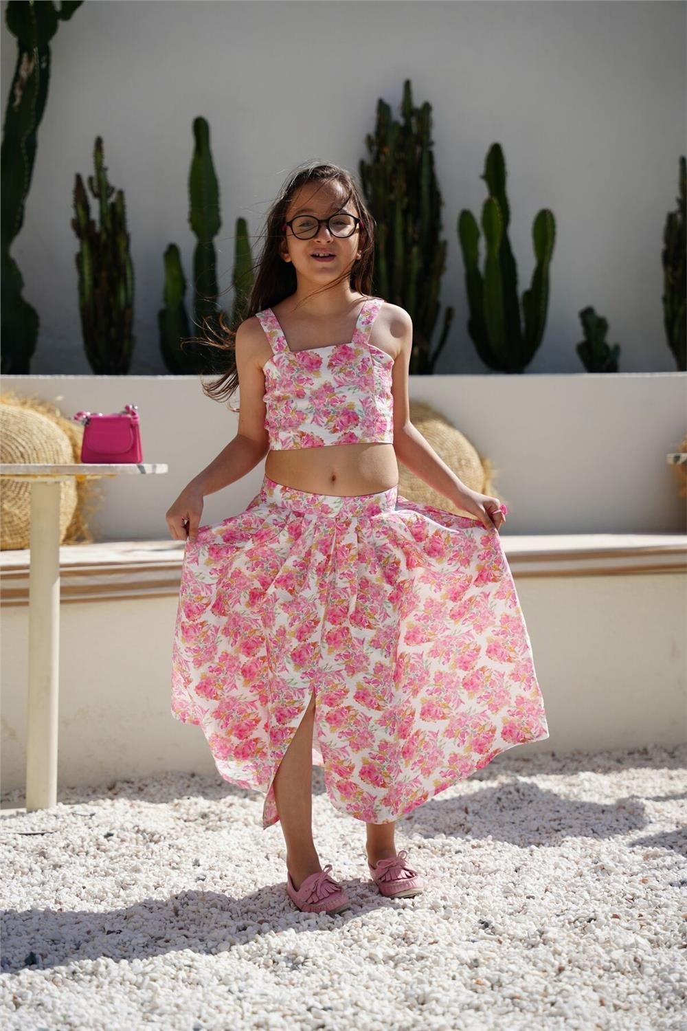 Yaz ayları için ideal bir tercih olan çiçek desenli etekli takım, hafif ve zarif tasarımıyla her yaştan kız çocuğuna hitap etmektedir.