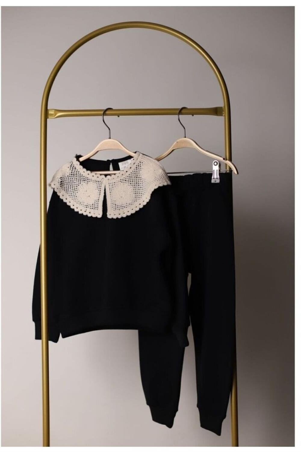 Kız çocukları için özel olarak tasarlanmış bu dantel yakalı eşofman takımı, stil ve konforu bir arada arayan ebeveynler için mükemmel bir seçimdir.