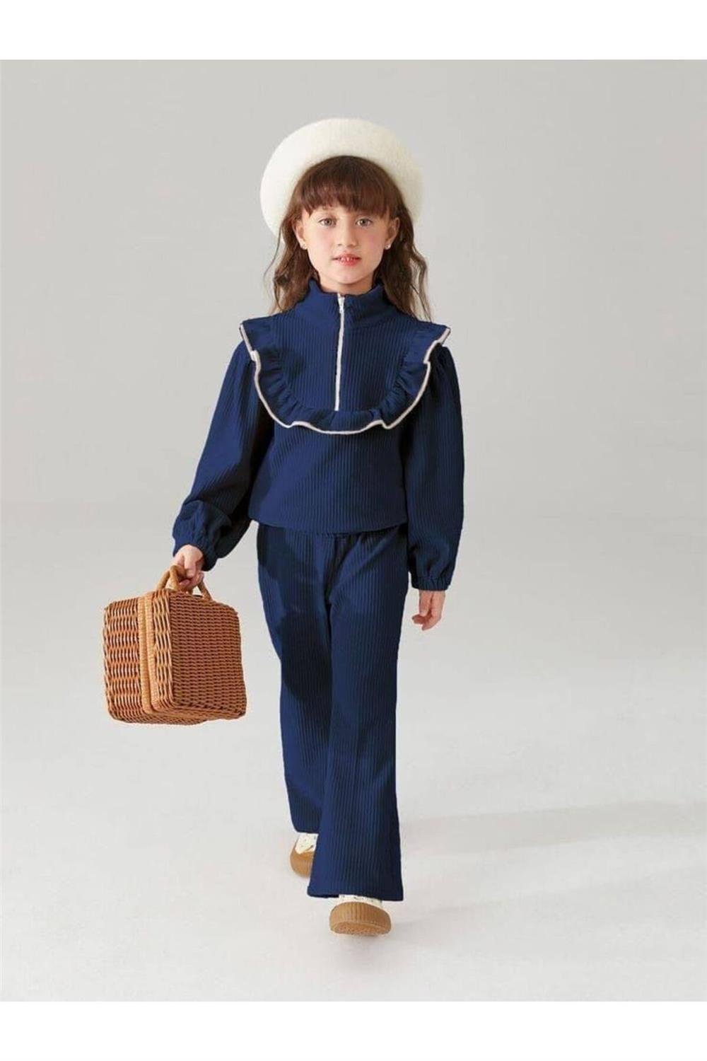 Kız çocukları için tasarlanmış olan bu şık takım, zarif detayları ve modern kesimi ile dikkat çekmektedir. Dik yaka ve fermuar detayları, hem estetik bir görünüm sunmakta hem de kullanım kolaylığı sağlamaktadır. Omuzdan fırfır detayları, takıma hareket katarken, genç kızların stiline zarif bir dokunuş ekler.