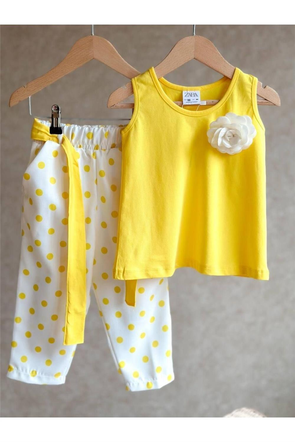 Zarif bir görünüm sunan bu yazlık takım, şıklığı ve feminen detayları bir araya getirerek her yaştan kız çocuğuna hitap etmektedir. Sarı rengin canlılığı, takıma enerji katarken, alt kısmındaki puantiye detayları ve belinden bağcıklı tasarımı, hem rahatlık hem de estetik bir görünüm sağlar. Üst kısmında yer alan zarif gül detayları, takıma sofistike bir dokunuş ekleyerek, özel günlerde veya günlük kullanımda şıklığı tamamlar.