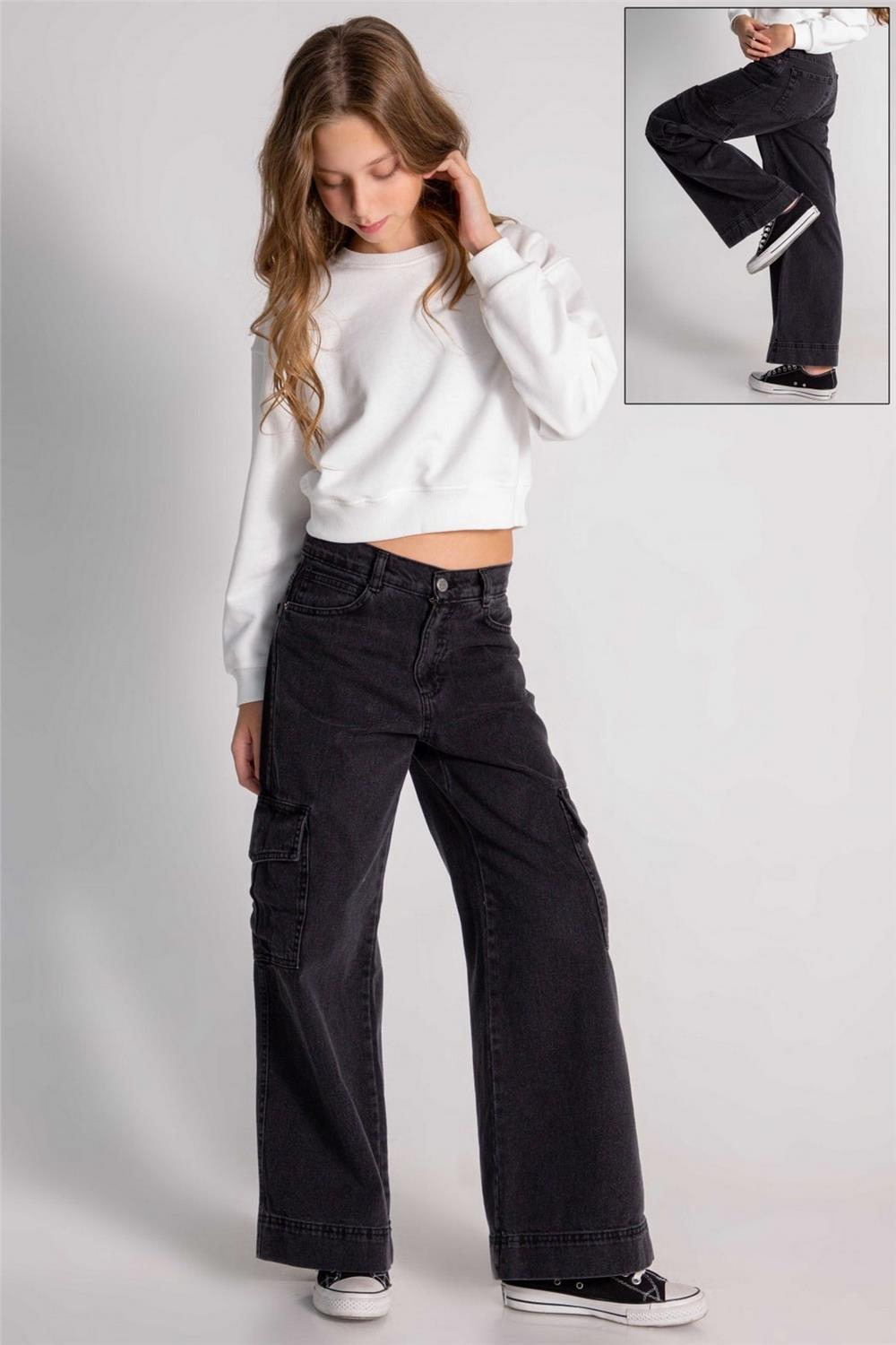 Kız çocuk kargo cepli jean pantolon, stil ve işlevselliği bir arada sunarak, genç modasına katkıda bulunur.