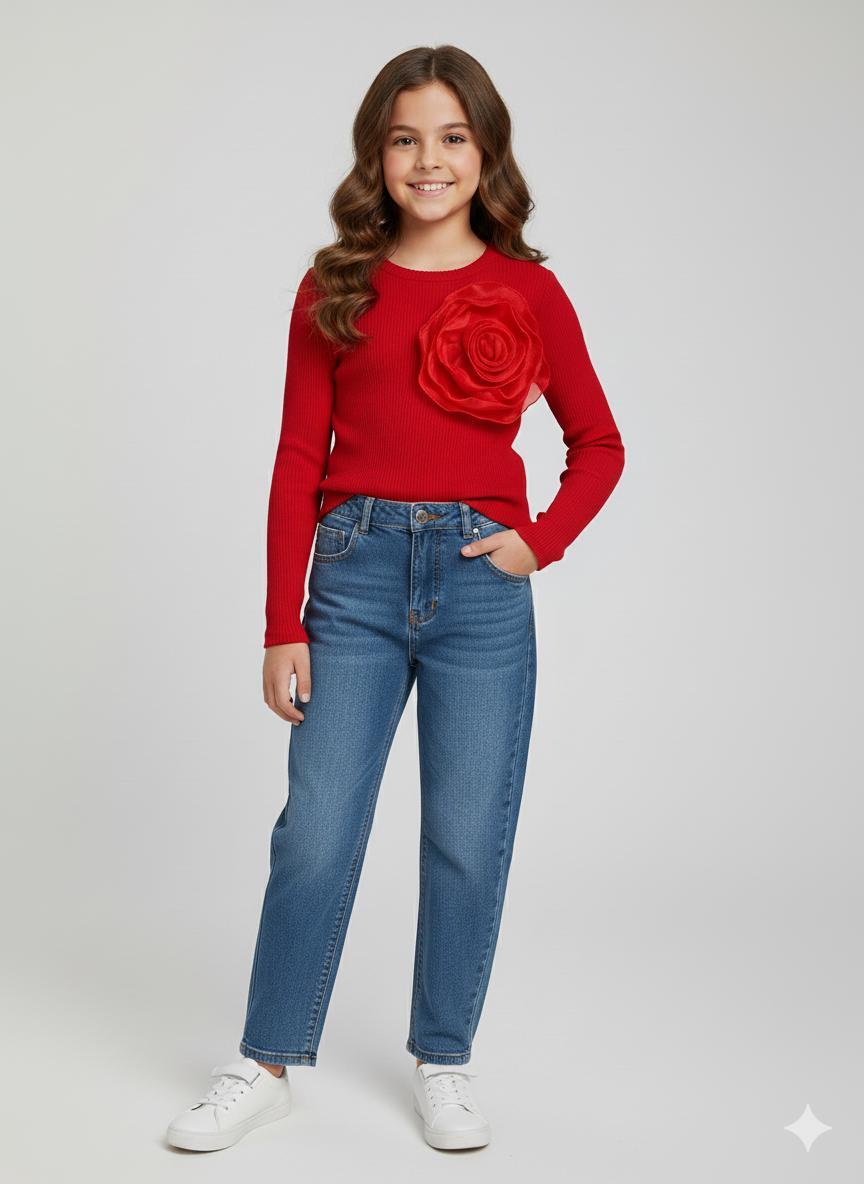 Güllü detaylar, bluzun genel estetiğine zarif bir hava katmakta ve genç kızların stilini ön plana çıkarmaktadır. Kırmızı rengi, enerjik ve canlı bir görünüm sunarak, her türlü kombinle uyum sağlamaktadır.