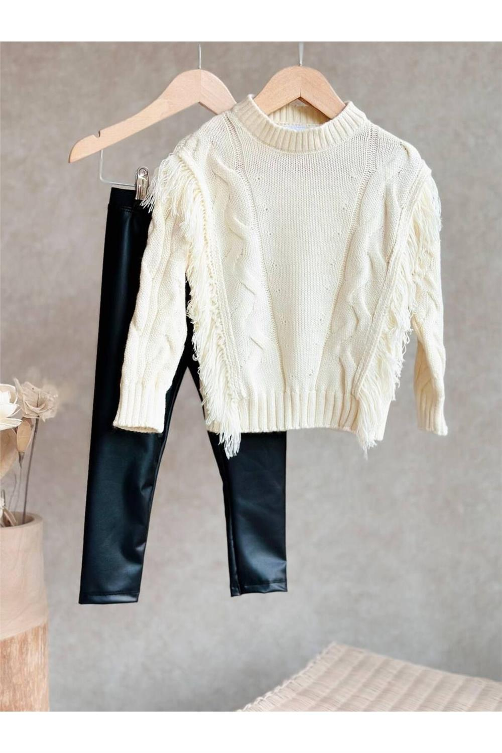 Kız çocukları için tasarlanmış bu kışlık triko kazak ve deri taytlı takım, hem şıklığı hem de konforu bir arada sunmaktadır. KREM rengi ile zarif bir görünüm sağlayan bu takım, soğuk havalarda sıcak tutma özelliği ile öne çıkmaktadır.
