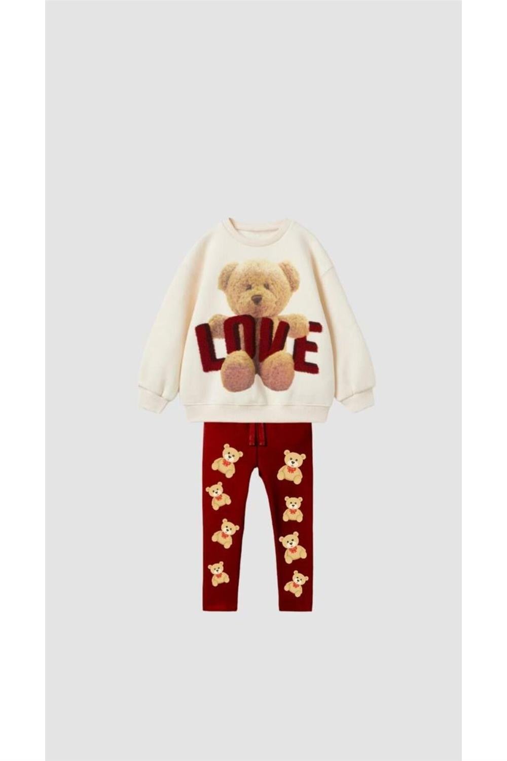 Kız çocukları için özel olarak tasarlanmış taytlı takım, günlük giyimde hem konfor hem de şıklığı bir arada sunmaktadır. Üst kısmı, 3 iplik kaliteli kumaş kullanılarak üretilmiş olup, yumuşak dokusu sayesinde sıcak tutma özelliği taşımaktadır. Ön kısımda yer alan sevimli ayıcık ve “Love” yazılı baskı detayları, takımın eğlenceli ve çekici bir görünüm kazanmasını sağlamaktadır.