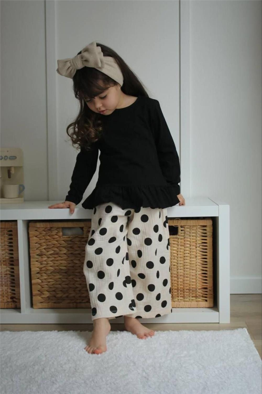 Kumaş ve TasarımKız çocukları için özel olarak tasarlanmış bu takım, uzun kollu müslin kumaş üst kısmı ve etek ucu hareketli penye detayları ile dikkat çekmektedir. Alt kısımda yer alan bol paça pantolon, puantiye desenleri ile modern bir estetik sunarak, genç kullanıcıların stiline zarafet katmaktadır.