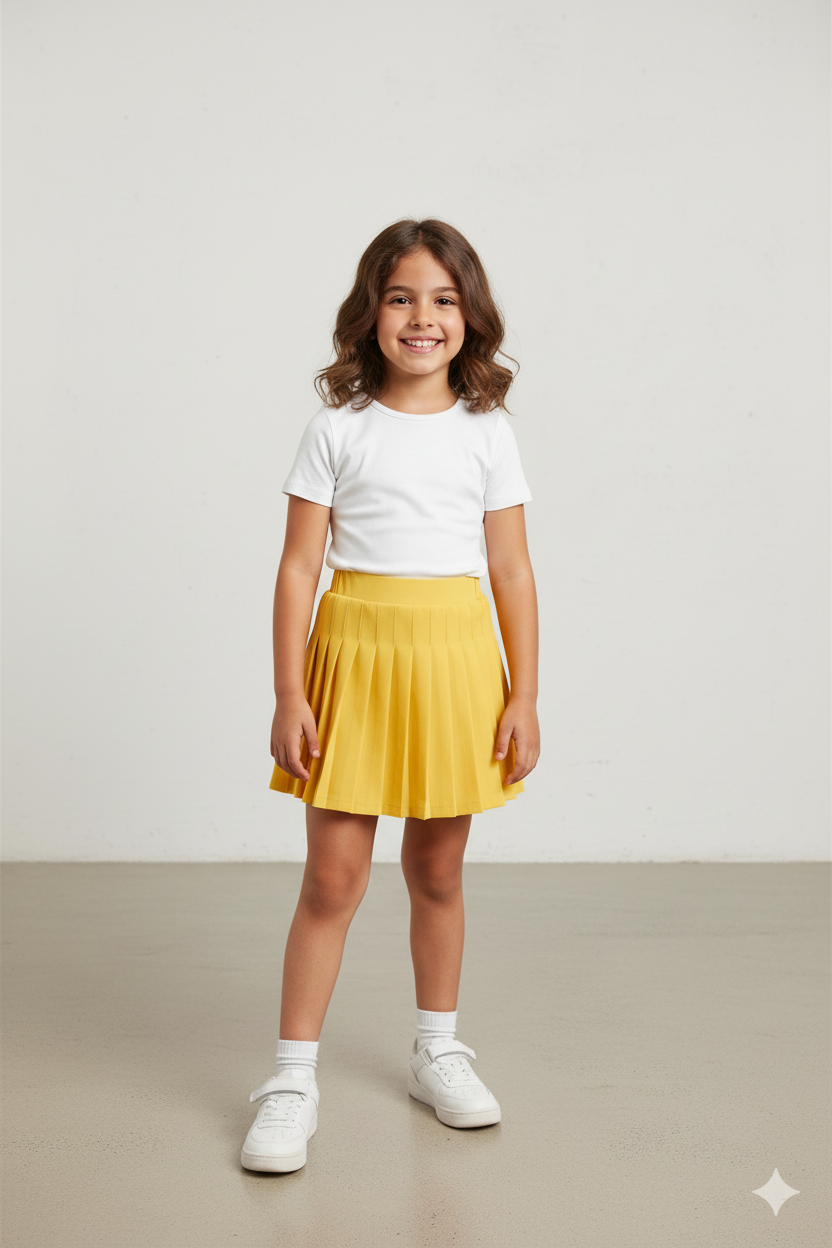 Kız çocukları için tasarlanmış olan pileli şort etek, hem şıklığı hem de konforu bir arada sunmaktadır. SONGÜLBERİK markasının özenle ürettiği bu sarı etek, genç kızların günlük giyimde rahatlıkla kullanabileceği bir seçenektir.