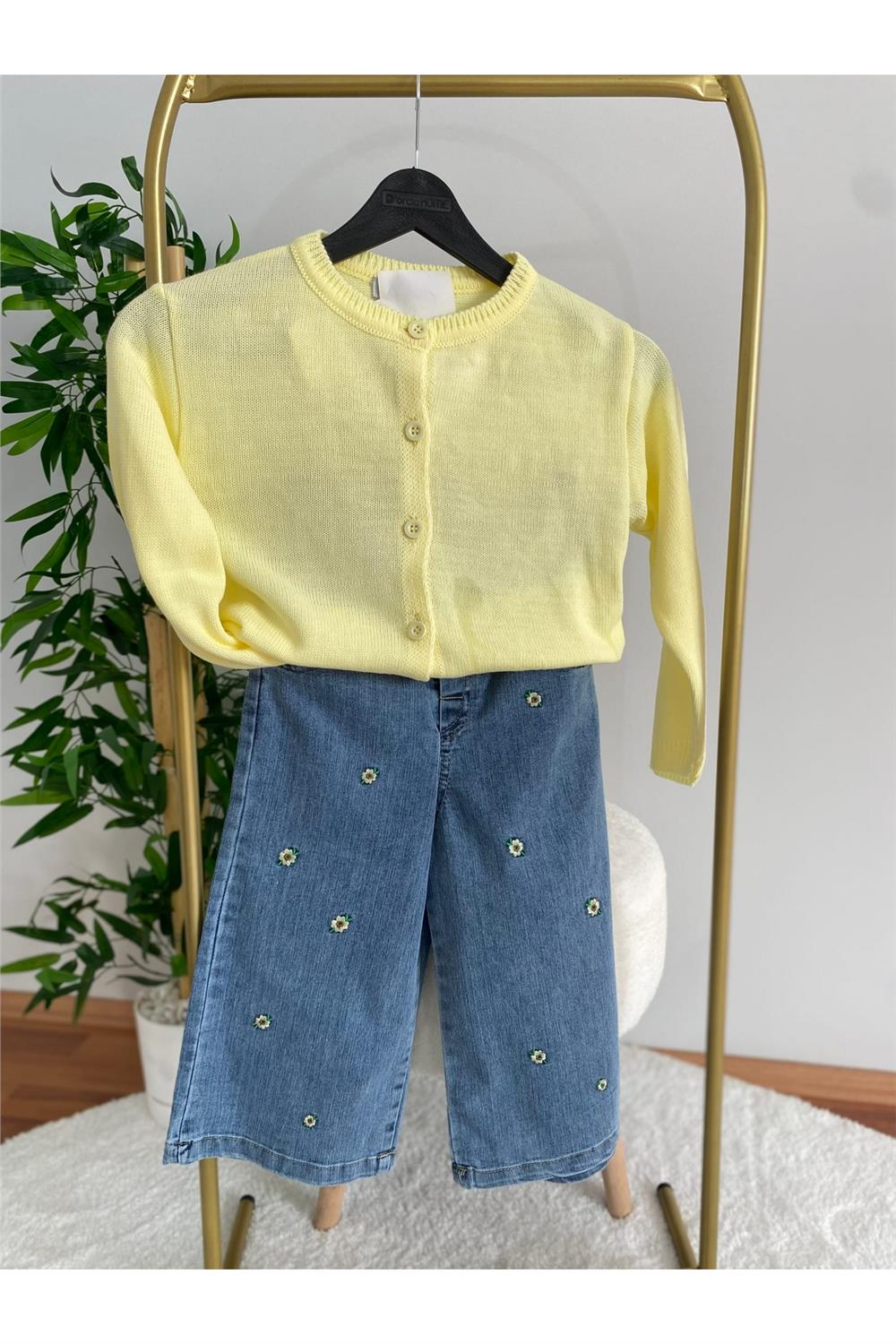 Kız çocukları için ideal bir giyim seçeneği olan sarı hırka nakışlı jean takım, stil ve konforu bir arada sunarak, her anı özel kılmaktadır.