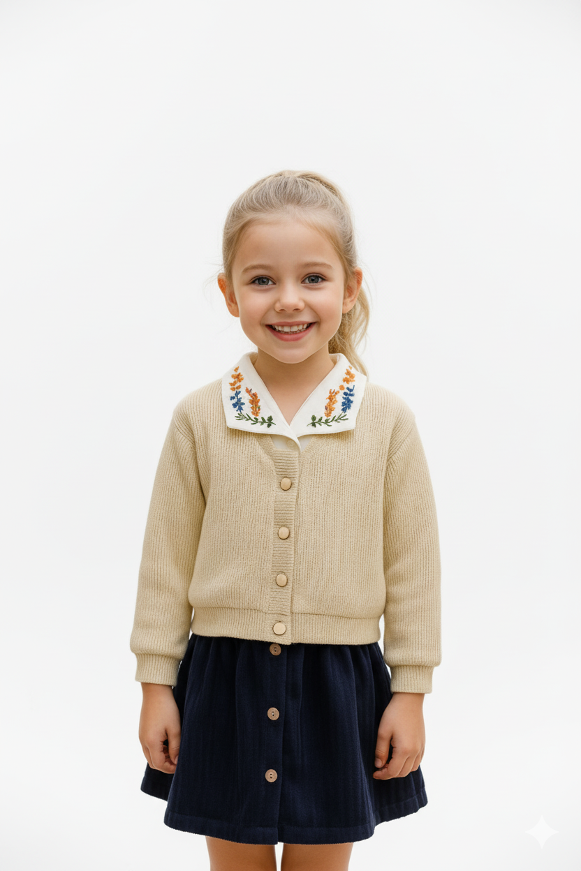 Zarif nakış detaylı yaka tasarımıyla dikkat çeken bu takım, şıklık ve konforu bir araya getiriyor. Düğmeli triko hırka ve düğme detaylı kadife etekten oluşan takım, sonbahar ve kış kombinleri için mükemmel bir seçimdir. Okul günlerinden özel davetlere kadar her ortamda zarif bir duruş sunar. Ürün Özellikleri: