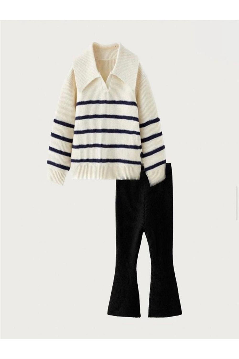 Kazak, yumuşak dokusu sayesinde çocukların cildine dost bir yapı sunarken, şık siyah-beyaz renk kombinasyonu ile her türlü kıyafetle uyum sağlar. İspanyol paça fitilli tayt ise, esnek yapısı sayesinde hareket özgürlüğü tanır ve gün boyu rahatlık sağlar.