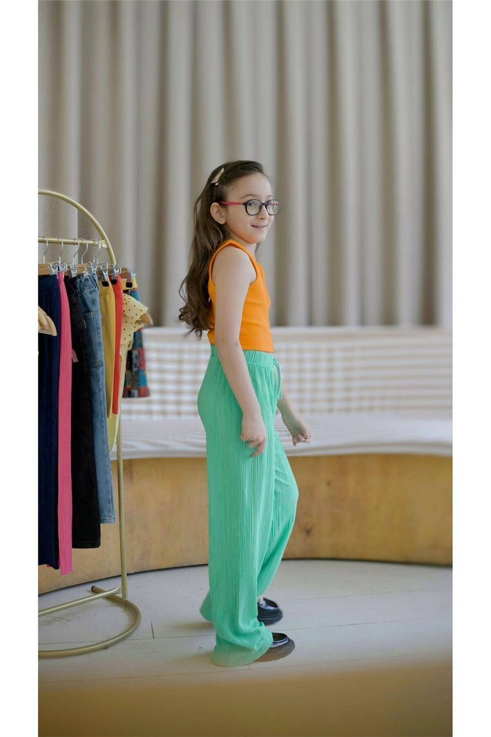 Kız çocukları için tasarlanmış yazlık pantolon, hem şıklığı hem de konforu bir araya getirerek genç modaseverlerin beğenisine sunulmaktadır. SONGÜLBERİK markasının özenle ürettiği bu pantolon, yeşil rengiyle yaz aylarının enerjisini yansıtırken, geniş paça kesimi ile hareket özgürlüğü sağlamaktadır.